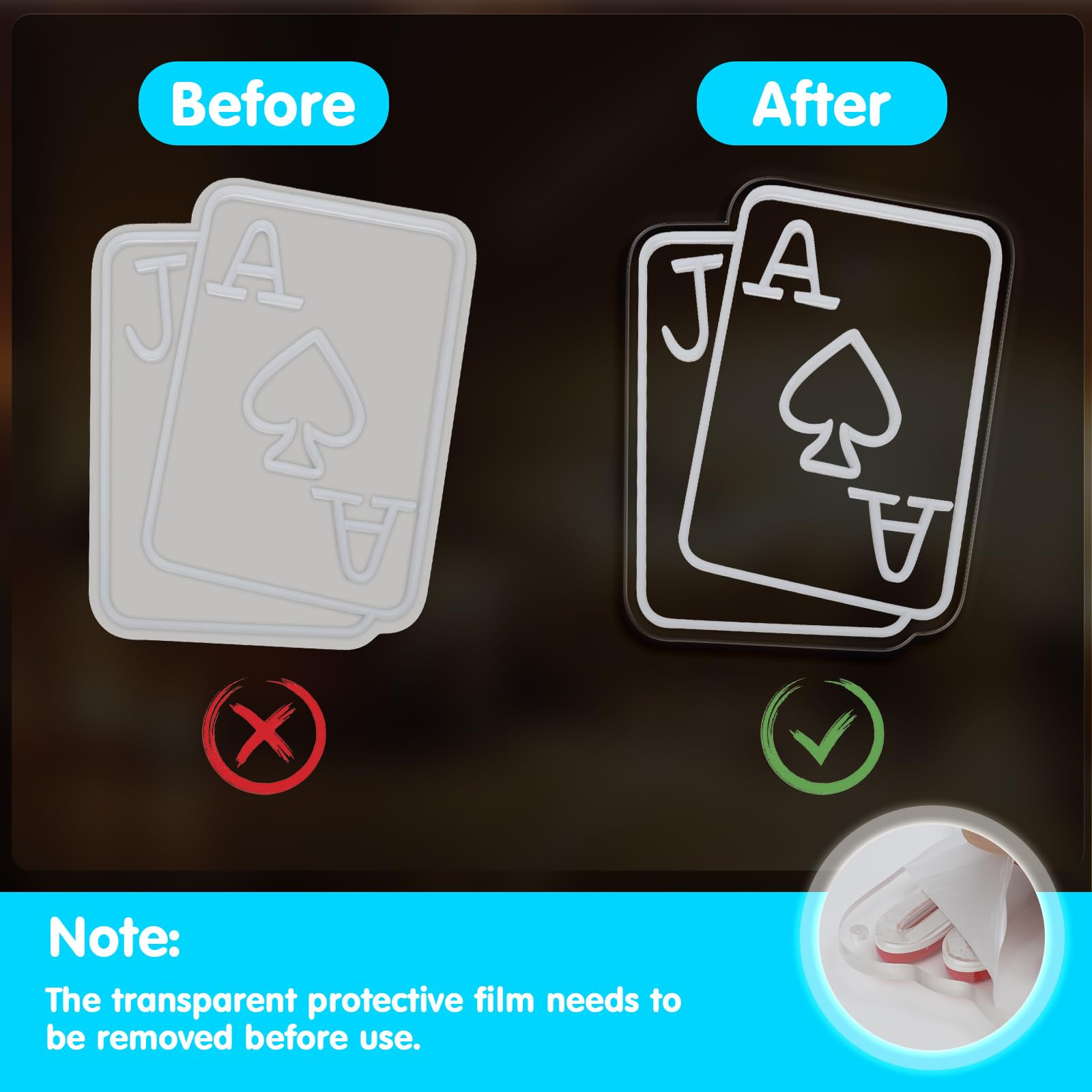 - 【Tips】The backplane of neon sign is transparent, please tear off the protective film from the back befor using.
